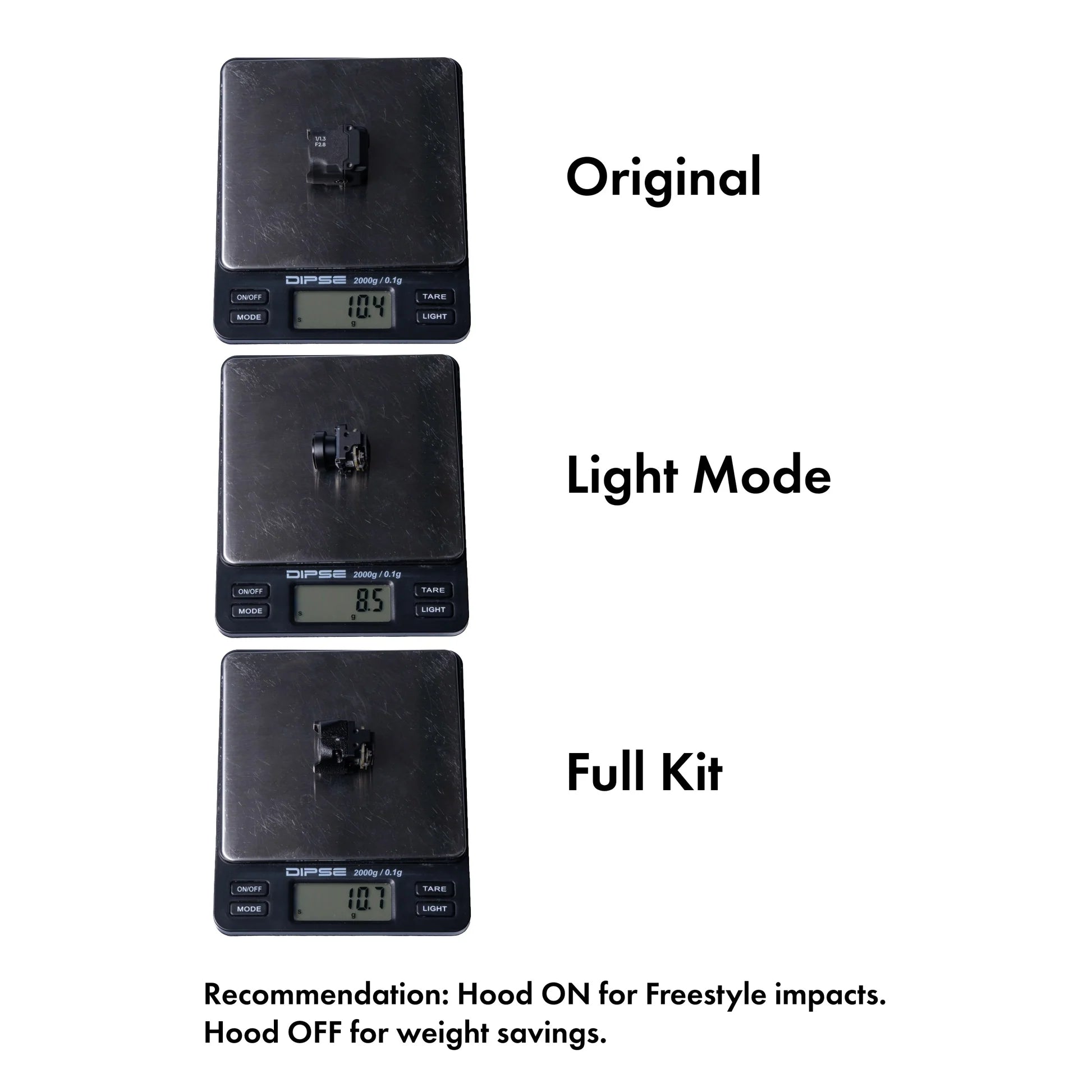Important Notes / Disclaimer: The kit is fully functional without the Nylon Lens Hood. We recommend running "Light Mode" (No Hood) only for Toothpicks or Whoops where weight is critical.